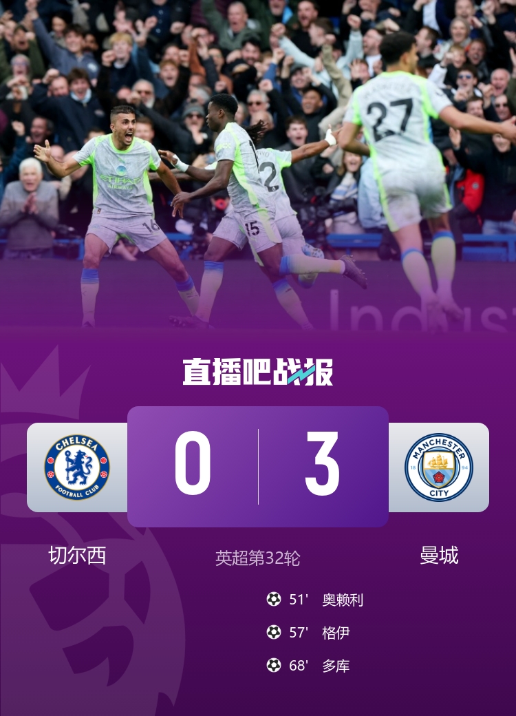 少赛1场距枪手6分!曼城3-0切尔西 奥赖利多库破门谢尔基两助攻