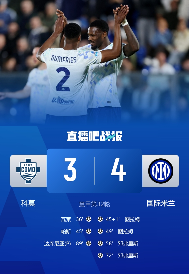 国米剩6轮9分优势领跑,图拉姆、邓弗里斯双响,帕斯破门+造点;科莫7轮不败遭终结。