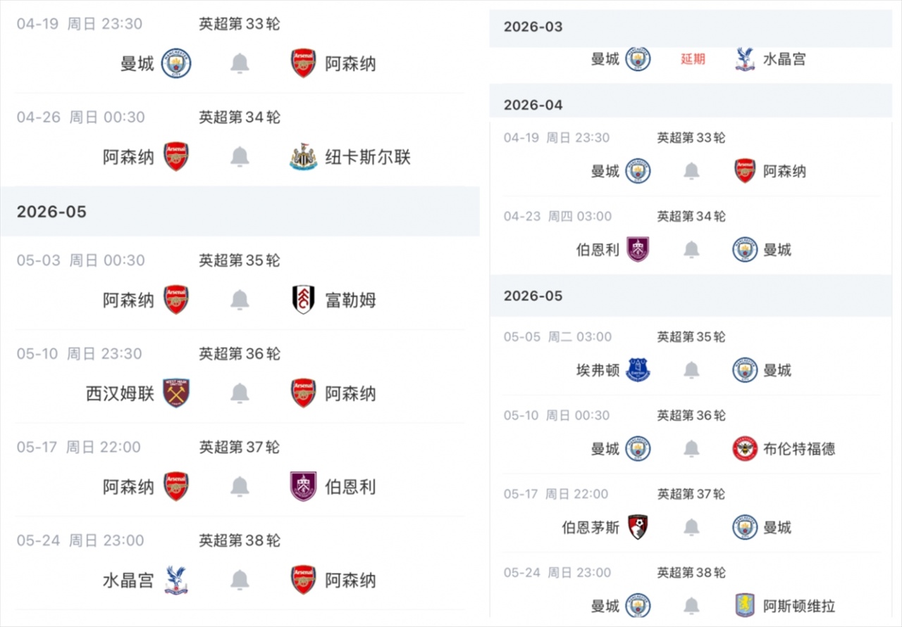 曼城少赛1场距榜首阿森纳6分,两队还有一场天王山之战下轮打响。两队赛程对比如上图。